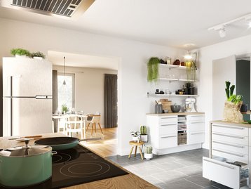 Nach Hause kommen und wohlfühlen. Das ist die Idee und das ist auch unser Anspruch. Unsere praktischen Grundrisslösungen machen es möglich. Eine Vorratskammer wird zum Helfer nach dem Einkauf. Ohne den lästigen Schmutz im Haus und mit genügend Lagermöglichkeiten. Der Blick wandert unverstellt weiter in die großzügige Küche mit Essbereich.
